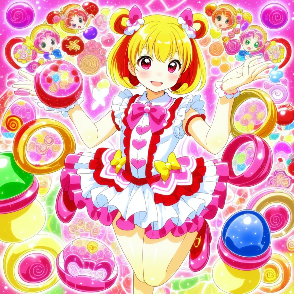 Hanamichi ran, delicious party precure, 1girl, red eyes, brown hair, blonde hair, short hair, medium hair, hair rings, magical girl, by artist blvefo9, anime