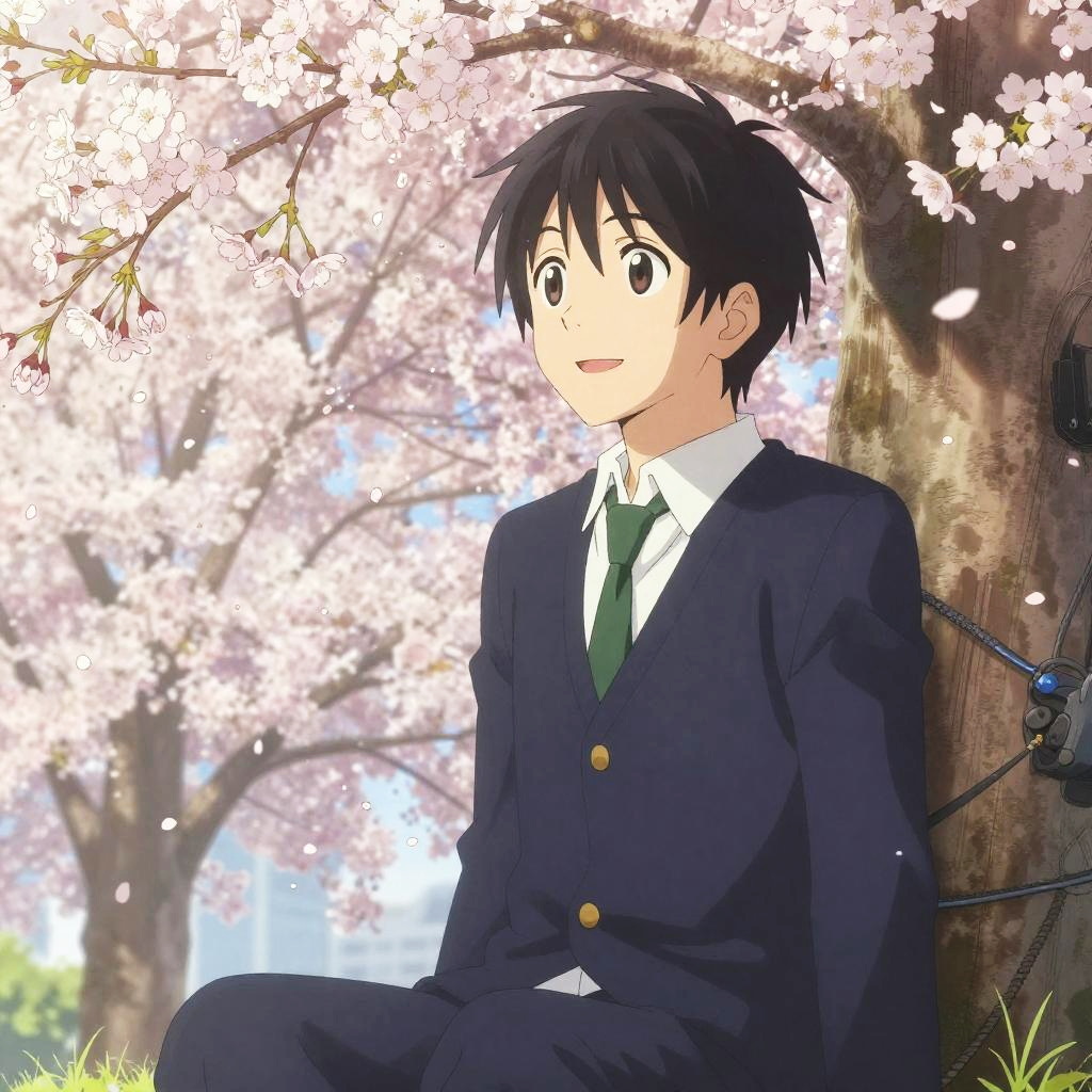 Anime boy purple hair, sitting under cherry blossom trees in full bloom, soft pastel colors, gentle breeze, detailed kimono with intricate patterns, serene and contemplative mood.
