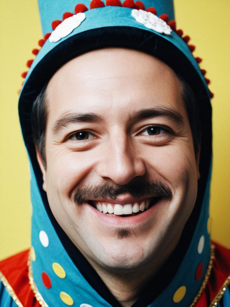 Person in Funny Fancy Dress Outfit, close-up cheerful headshot, photorealistic realism