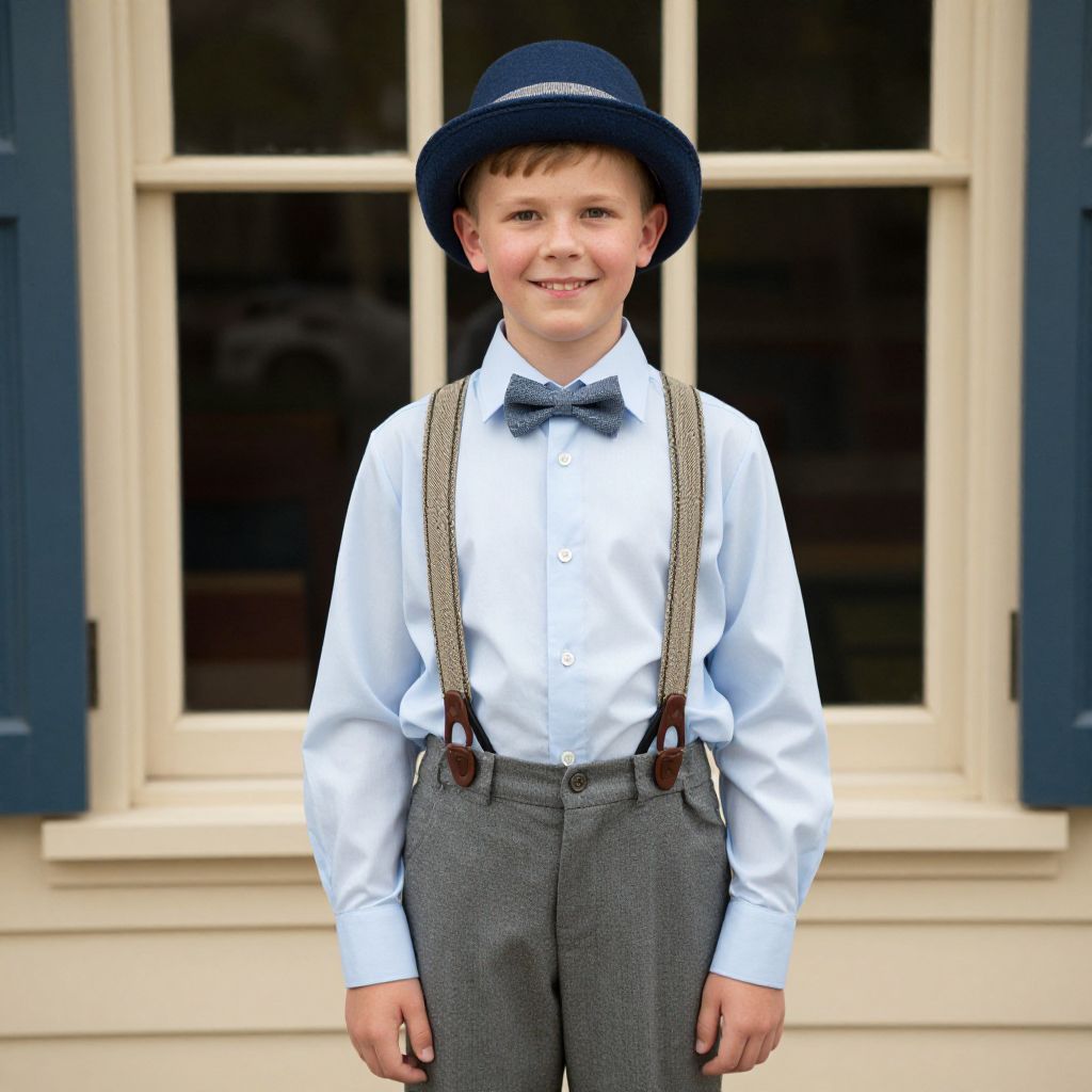 Kid 20s Newsie Costume, boy in a hat and shirt and suspenders standing in front of a window