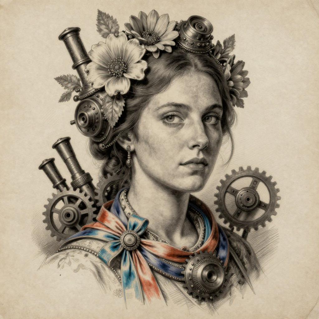 [Martin Ansin:Helen Allingham:0.4] realistic Lithography sketch portrait of a woman, flowers, [gears], pipes, dieselpunk, multi-colored ribbons, old paper texture, highly detailed