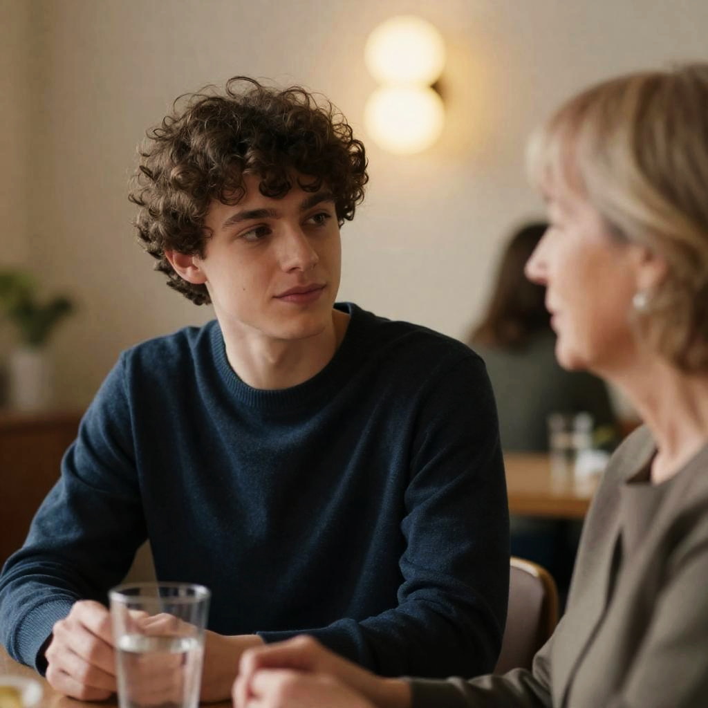 Photograph of three young men in a dimly lit room. Foreground: curly-haired man in black shirt, intense expression, facing another man with dark hair in blue and brown jacket, who is pointing at him. Background: third man with short hair, neutral expression, slightly blurred. Wooden shelves on left, dark walls. Intense gaze between main two subjects.