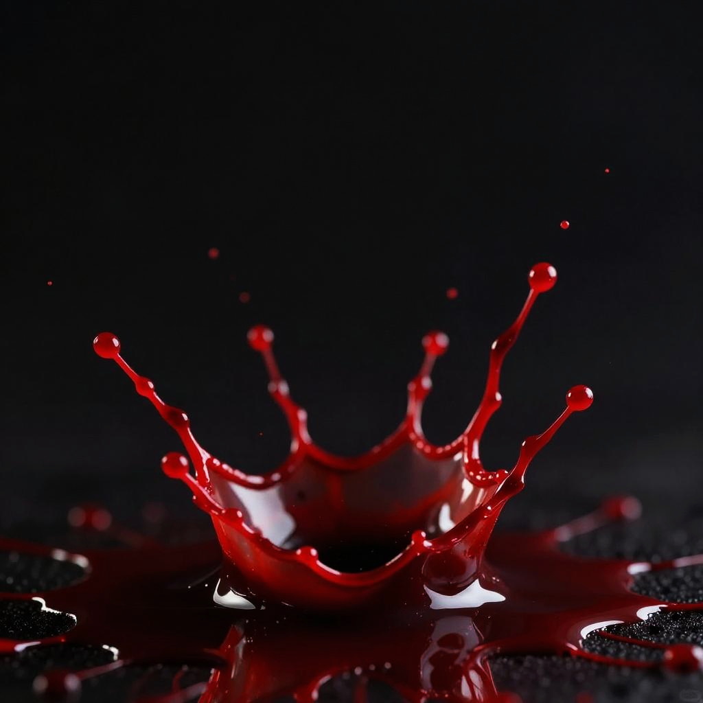 Dark black background contrasted with realistic blood splatter, fine red sprays and thick blood pools blending seamlessly, dynamic motion captured in the droplets, high resolution with a slightly glossy and textured appearance, eerie and powerful visual.