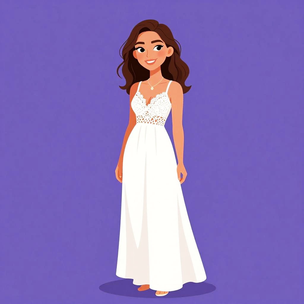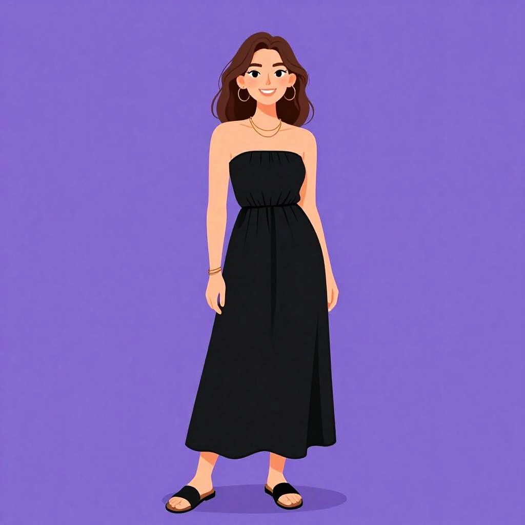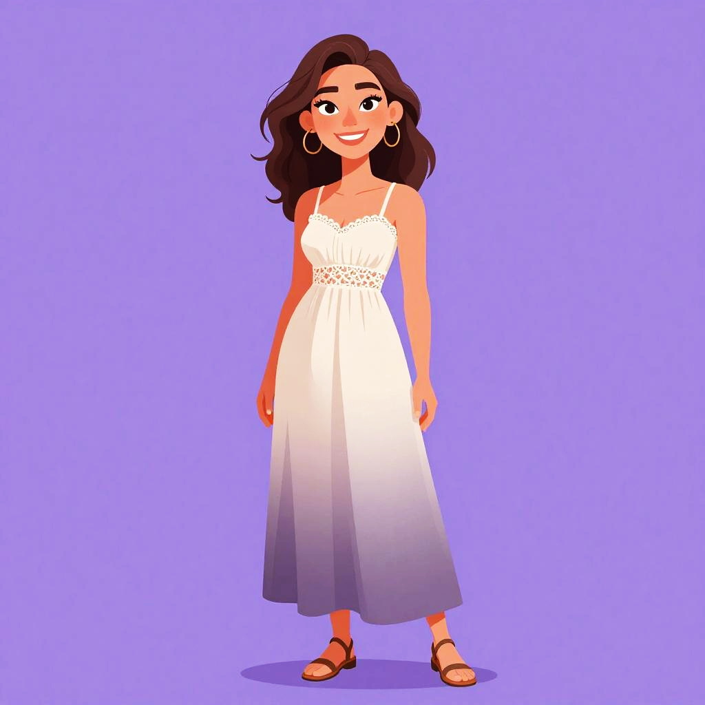 Woman with pretty face and pretty hair. smiling Woman, bohemian chic, empire waist maxi dress with color gradient, beige to gray, thin spaghetti straps, gathered detailing at the bust, delicate lace trim under the bust and at the midsection, soft pleating, sheer gray fabric from mid-calf to hem, worn with flat strappy sandals, studio background --sref 1467