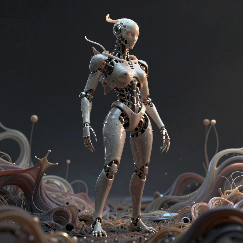 Body:lprrfniq0uu= surreal biomechanical creature emerging from abstract digital landscape, seamless integration of organic and robotic elements, metallic textures with softly glowing accents, dark moody background, high detail