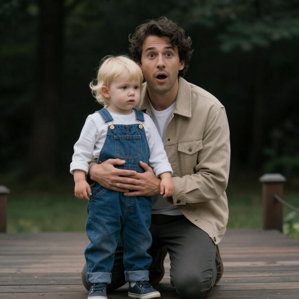 Photograph of a man with curly brown hair and a slight smile, wearing a white shirt with red stains, holding a small child with brown hair in his left arm. He raises a key in his right hand. The background is a smoky blue, with a bright light source below.