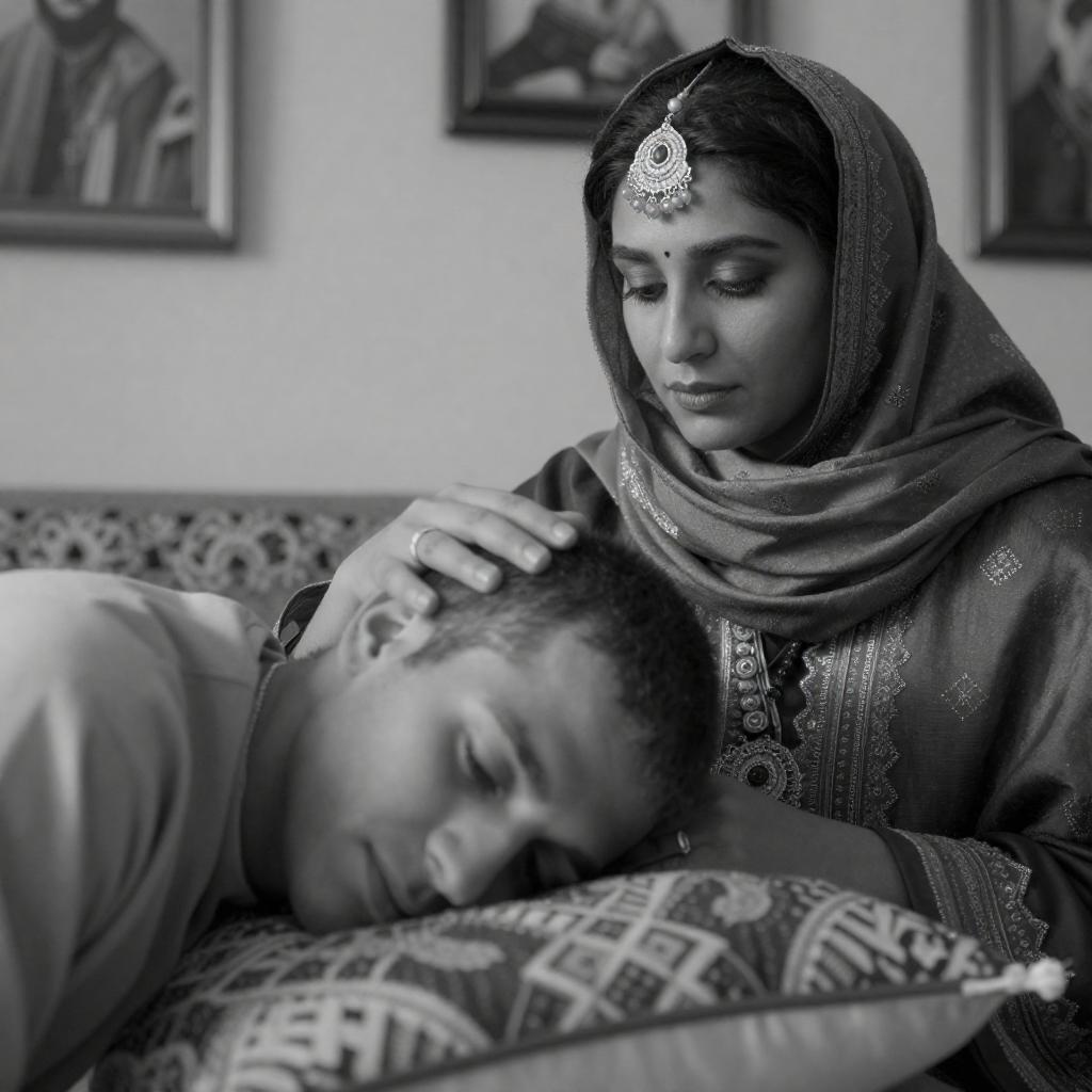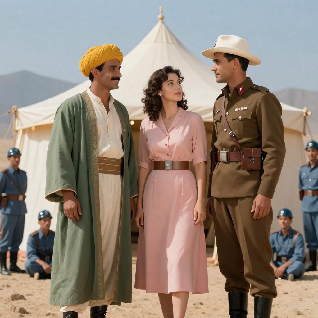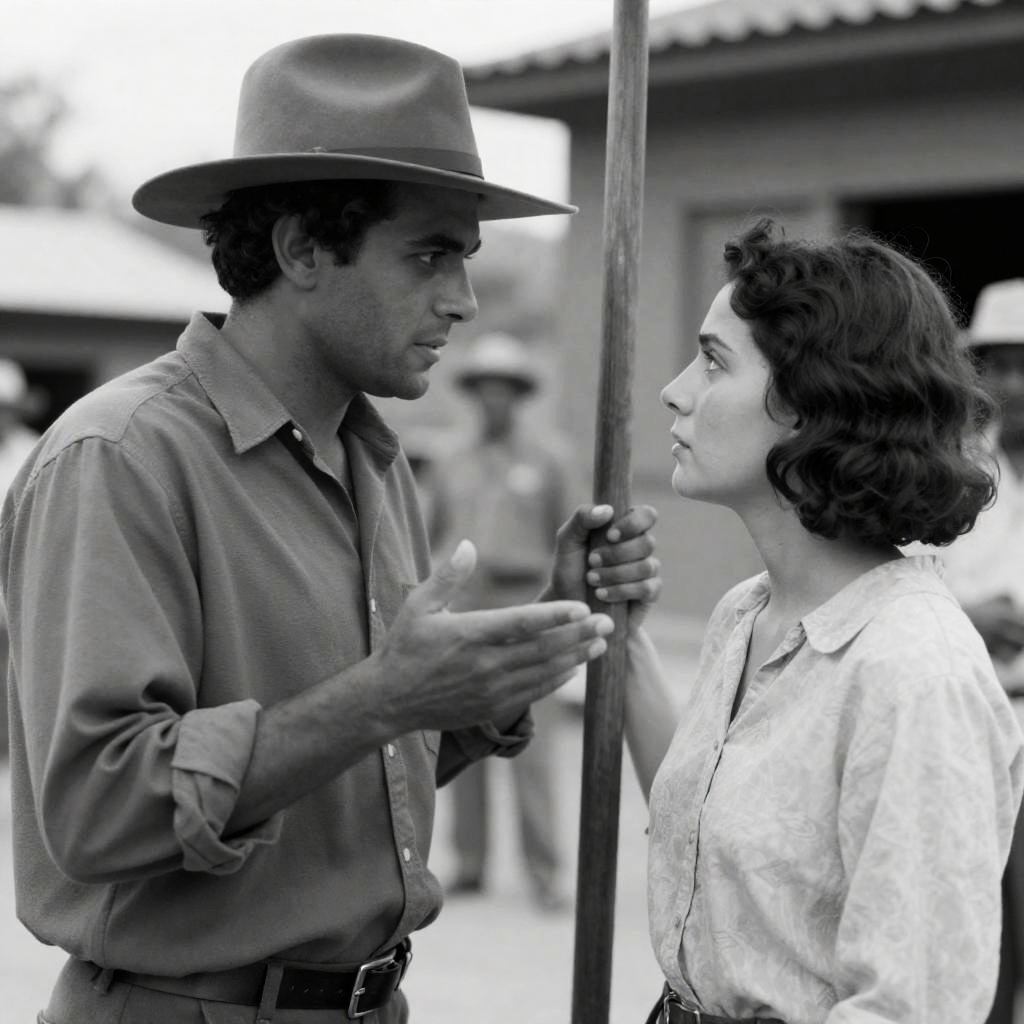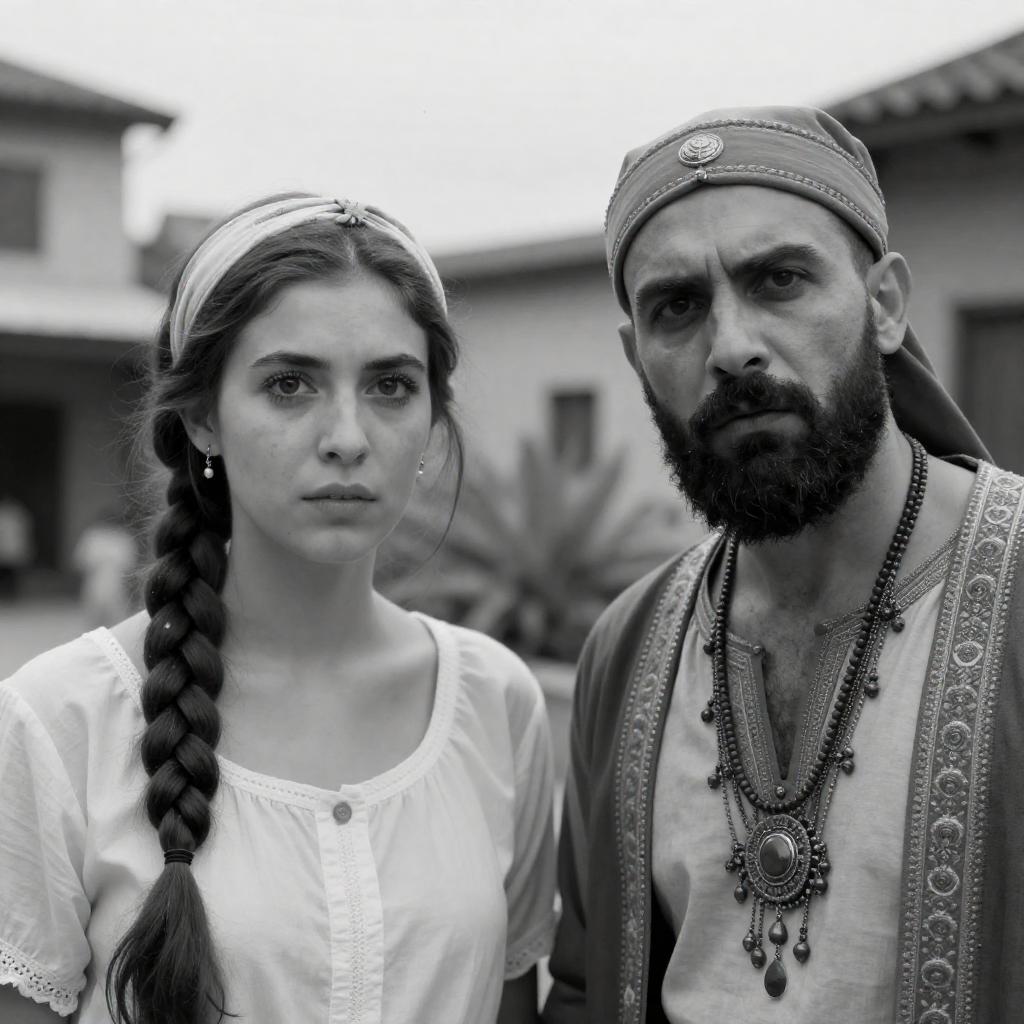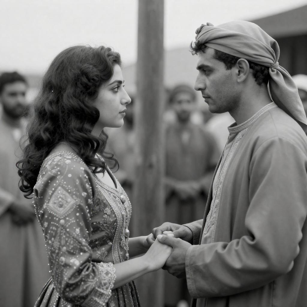 Black-and-white photograph of a historical scene. A woman with dark, wavy hair in an ornate, patterned dress stands facing a man in traditional attire with a headscarf, holding hands. Background includes blurred figures and a wooden post. The man looks intently at the woman, who gazes back with a serious expression.