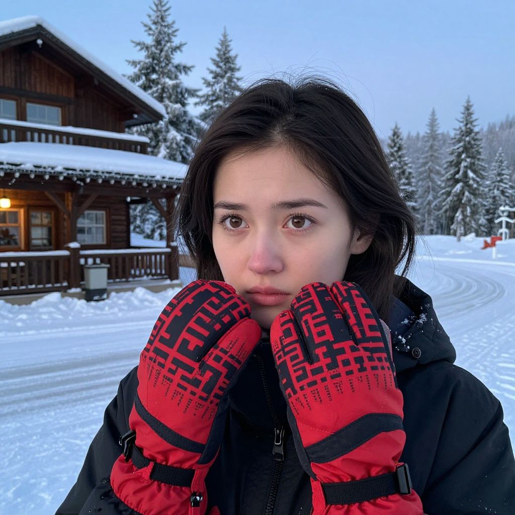 A detailed shot of a young woman with bright brown eyes and a slightly concerned expression wearing stylish, insulated ski gloves with a red and black pattern, standing near a snow-covered ski lodge at twilight, with frosty pine trees and icy trails in the distance.