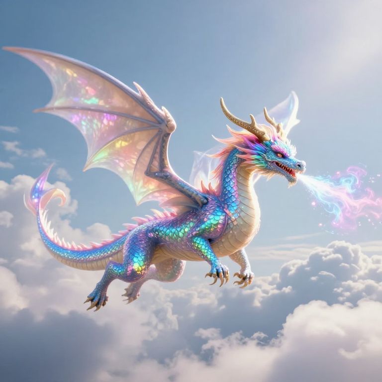 A radiant dragon with iridescent scales and a rainbow-hued mane soars amidst fluffy clouds, its ethereal form defying gravity as it breathes out shimmering, multicolored plumes.