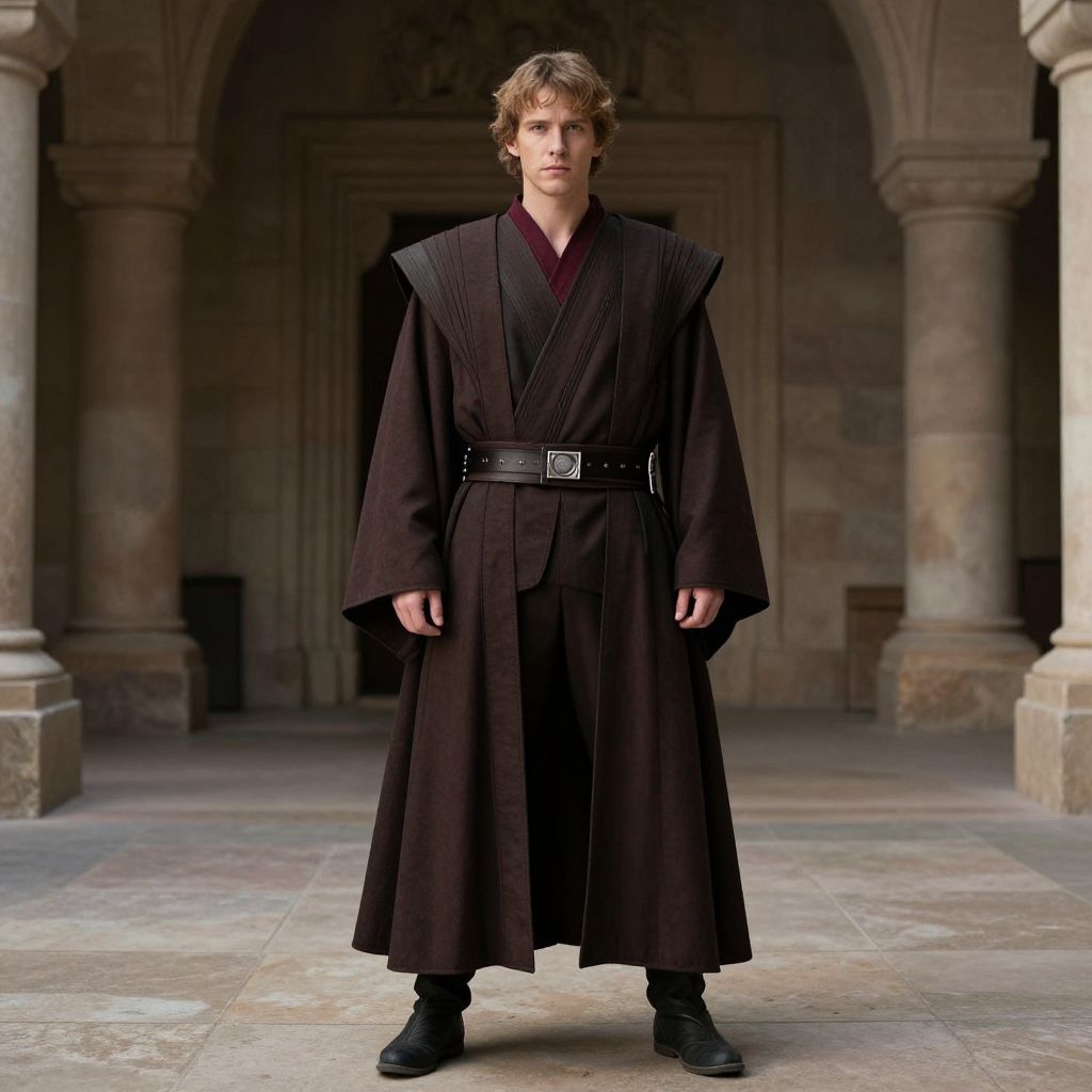 Photograph of a young man with wavy brown hair, wearing a black Jedi robe and belt, standing in a stone-columned, medieval-style hall