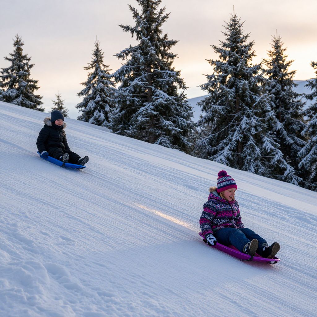 Toboggans on a snowy mountain slope at sunset, vibrant colors reflecting off the snow, children sliding down joyfully, detailed winter clothing, pine trees dusted with snow in the background, realistic style with soft lighting