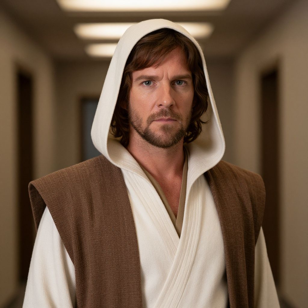 A photograph of a middle-aged Caucasian man with shoulder-length brown hair and a beard, wearing a white hooded robe with a brown tunic over it, reminiscent of a Jedi outfit from Star Wars. His expression is serious and focused, with blue eyes looking directly at the camera. The background is a blurred hallway with beige walls and rectangular ceiling lights. The image has a slightly dramatic, high-contrast style, highlighting the man's face and attire against the muted background.
