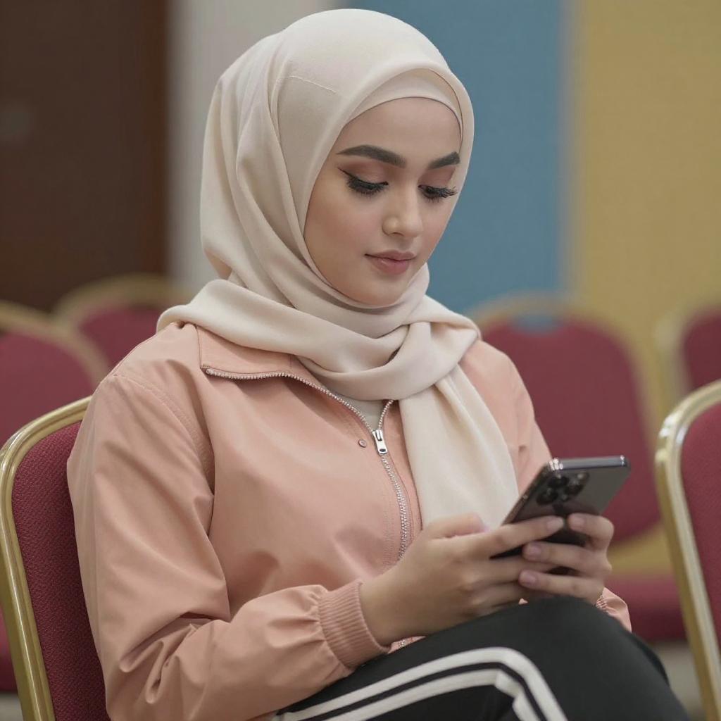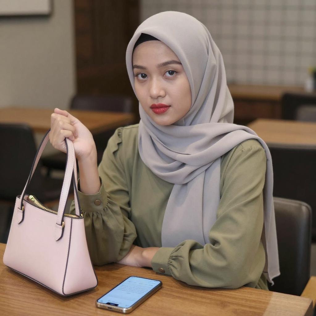 Photograph of a young Asian woman with fair skin and red lipstick, wearing a pink long-sleeve shirt and a light gray hijab. She sits in a brightly lit, modern office with white walls and vertical blinds, smiling slightly. Her right arm rests on a white desk in the foreground.