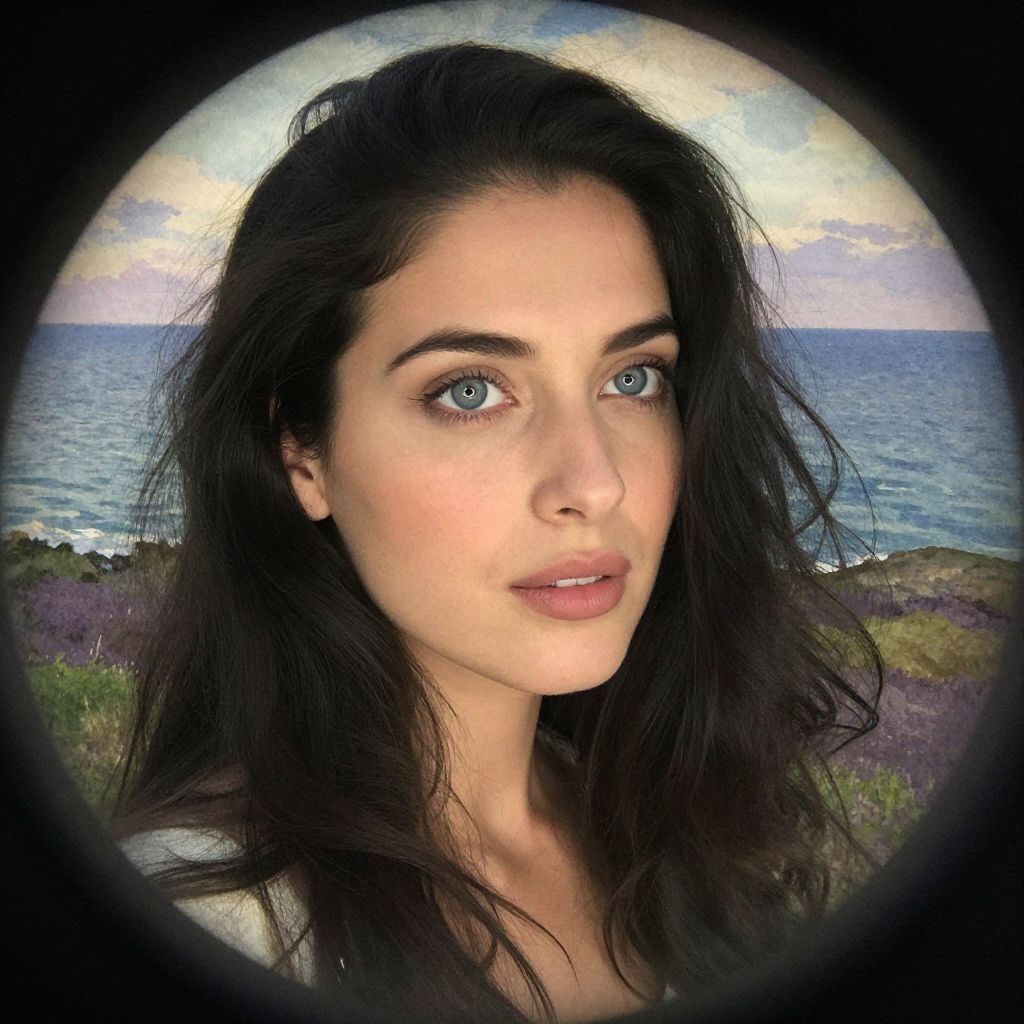 A photorealistic portrait presents a Mediterranean woman with deep indigo eyes and cascading raven hair, her expression serene yet enigmatic as she pensively gazes towards the horizon. Captured from an unusual aerial perspective akin to viewing through a vintage microscope lens, every strand of her luxurious locks and delicate facial contours are emphasized. Set against a dreamlike backdrop of interweaving watercolor patterns reminiscent of impressionist paintings, her skin radiates a warm glow, seamlessly blending reality with artistic expression. This captivating tableau embodies introspection and enchantment, inviting viewers to delve into the depths of her mesmerizing presence.