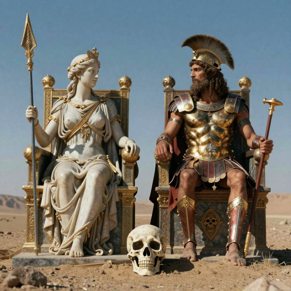 A hyperrealistic depiction of Greek deities Athena and Ares seated on ornately decorated thrones in a barren desert setting, symbolizing the Land of the Dead. Athena is portrayed as a white marble statue holding a spear, adorned with a crown and draped in classical robes with gold accents. Ares is depicted as a muscular man wearing ancient Greek bronze armor with a helmet featuring a crest and holding a staff. A skull rests prominently on the ground in front of them, enhancing the surreal atmosphere of the scene.