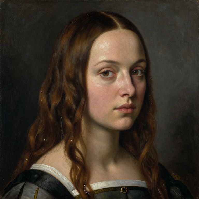Digital painting of a young woman with fair skin, long wavy brown hair, and soft facial features, wearing a dark, off-shoulder dress