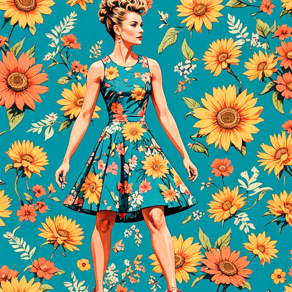 Portrait of a joyous athletic build woman with a faux hawk hairstyle wearing a retro floral sun dress featuring a pivoted hemline. She is set against a matching vibrant floral background with large yellow and orange flowers on a turquoise backdrop.