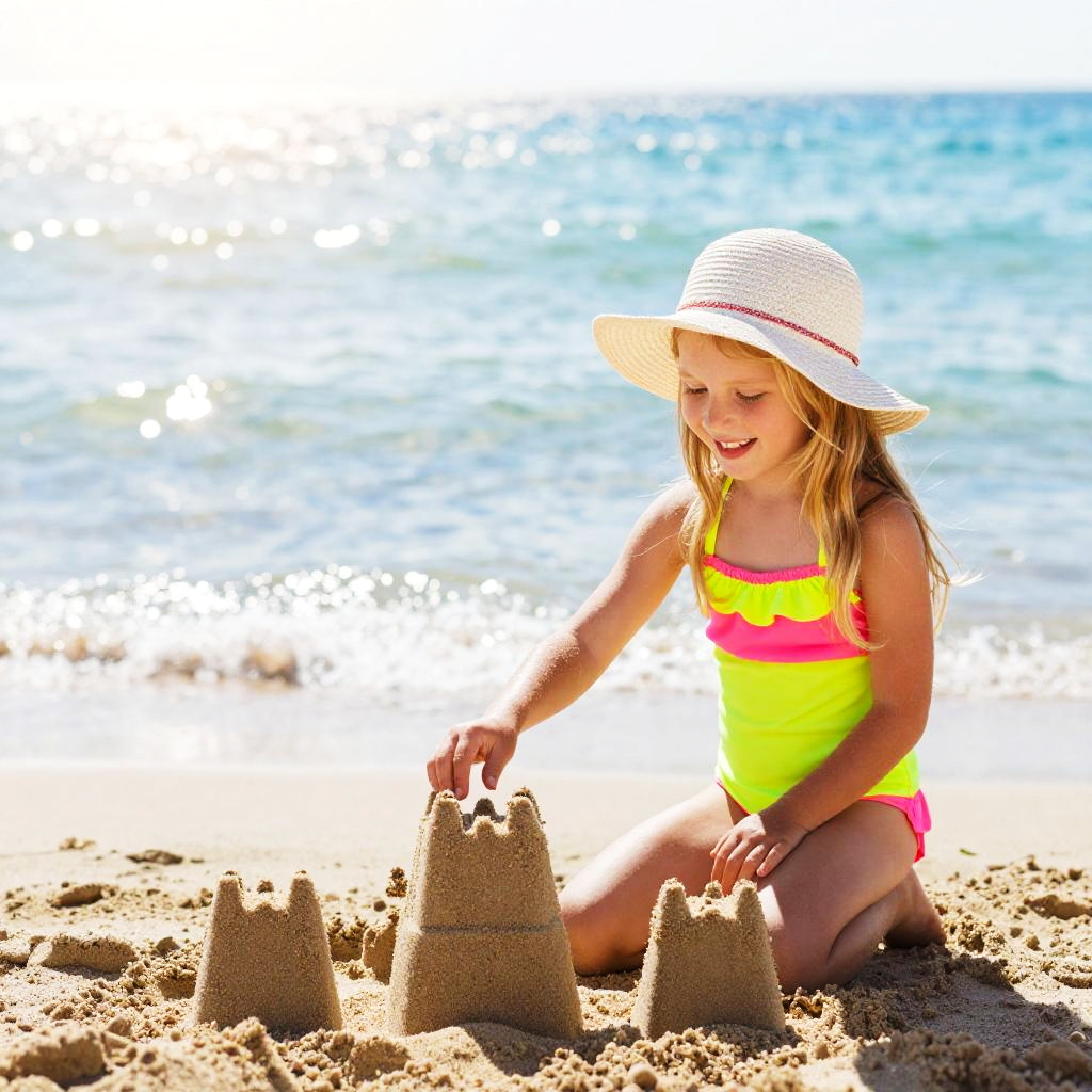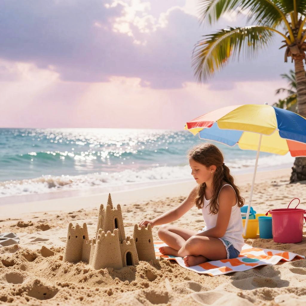 12 yo girl beach, young girl sitting on beach towel under colorful umbrella, building sandcastle nearby, sparkling sea and palm trees, soft pastel skies at sunset