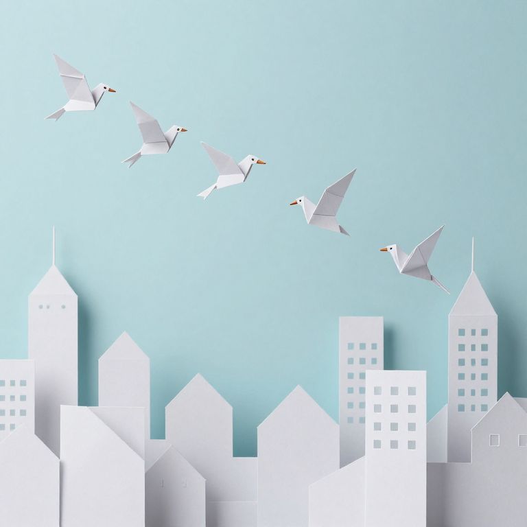 In a whimsical cityscape crafted from delicate paper, origami birds soar gracefully, carrying whispers of emotion and connection through the air, evoking a sense of wonder and serenity amidst the transient beauty of life.