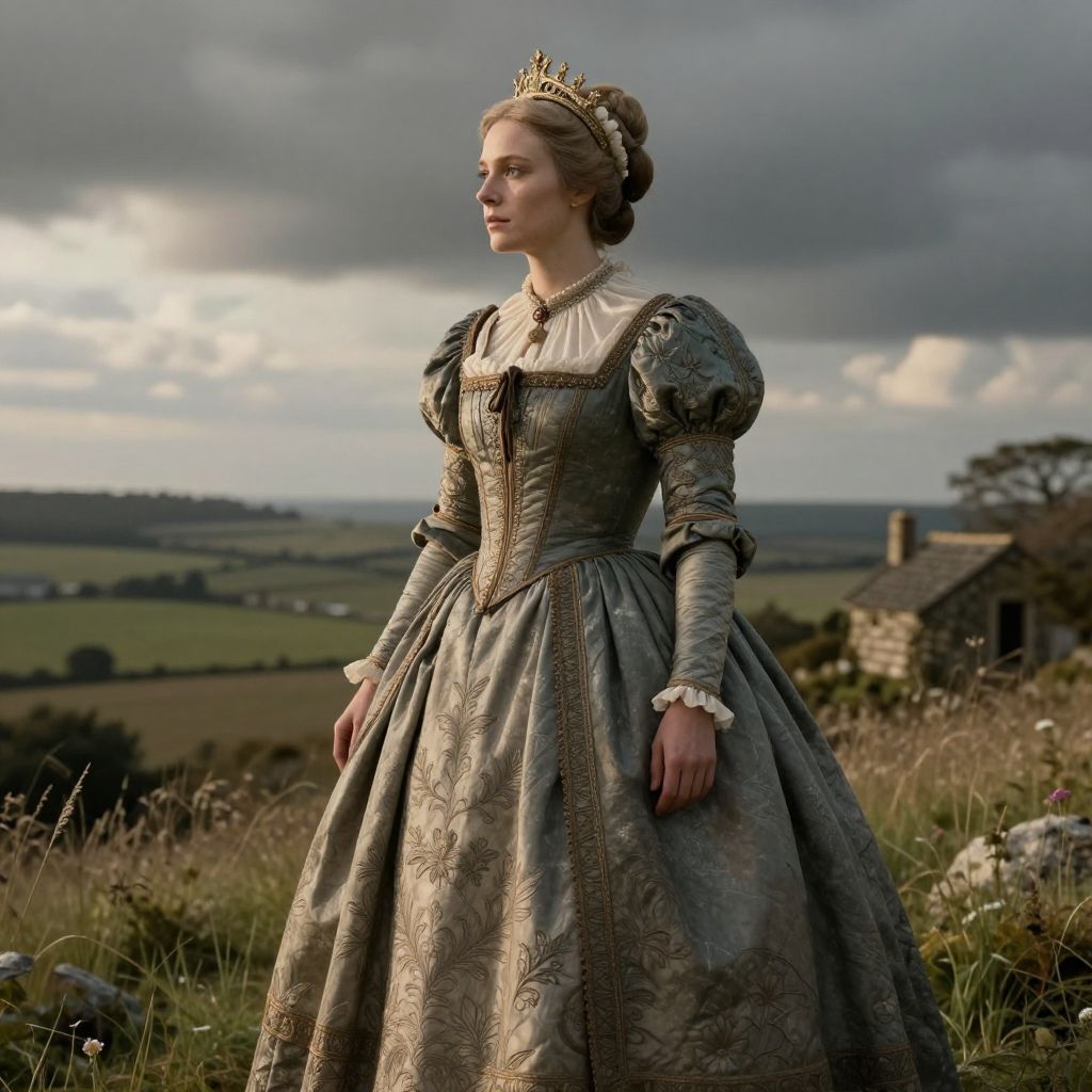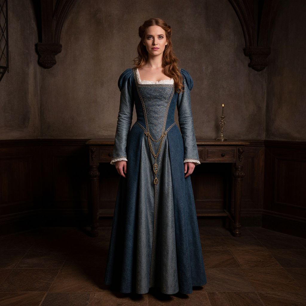 Photograph of a blonde woman in a medieval-style, blue and gold dress with puffed sleeves, standing in a dimly lit, stone-walled