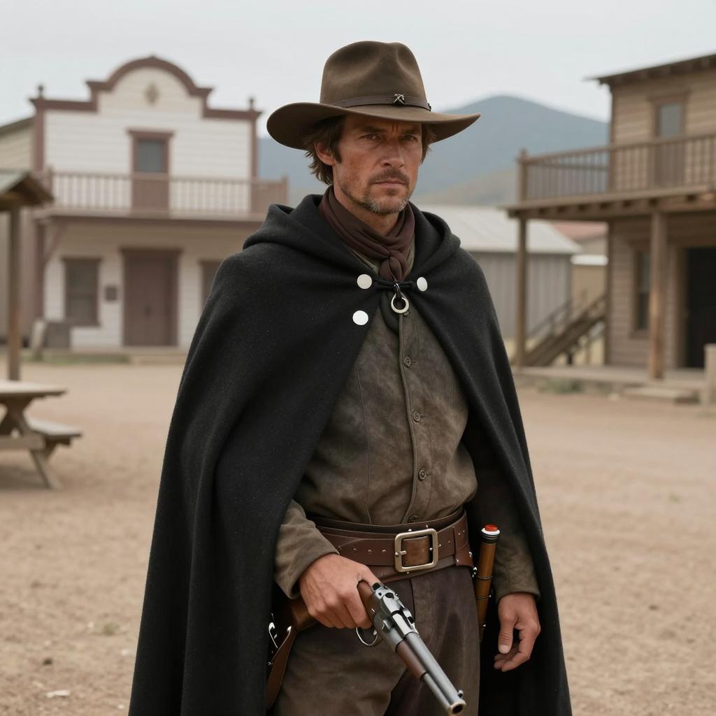 Man with brown hat and green cloak with white squares, holding gun, stands in dusty Western town. Background includes wooden buildings and white arch building. Mountains in distance. Neutral facial expression. Town has empty streets and few distant figures.