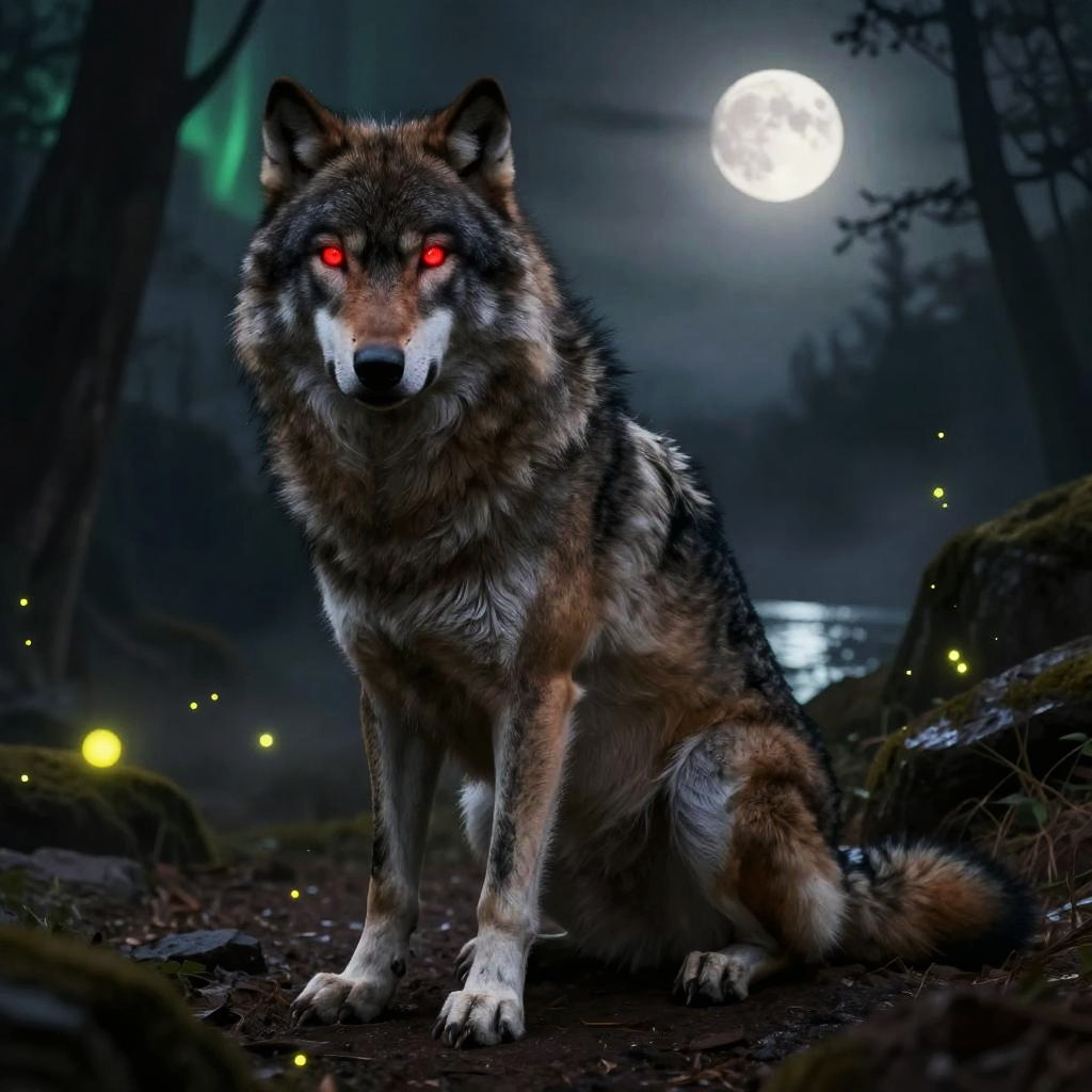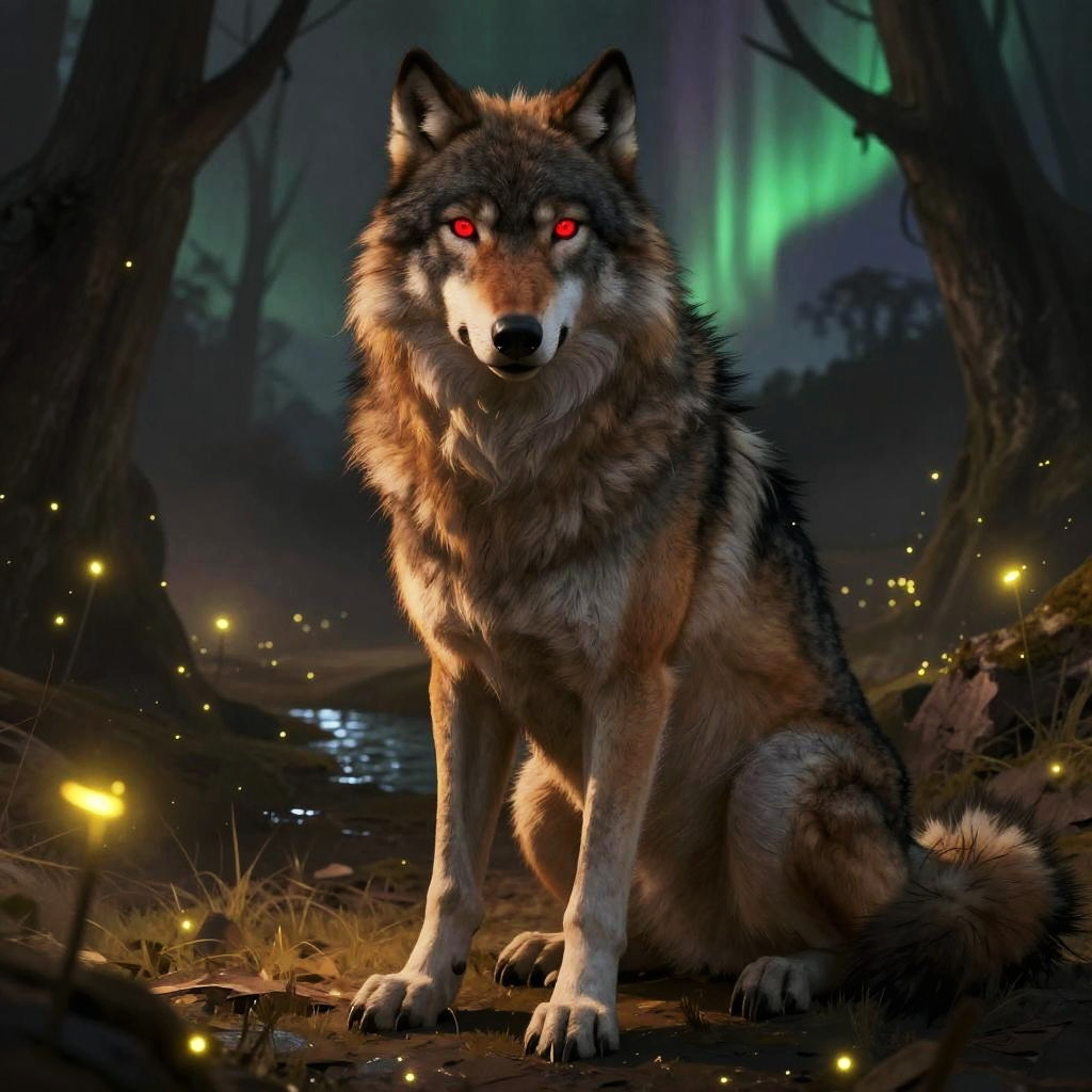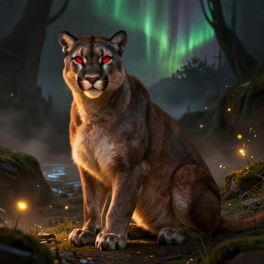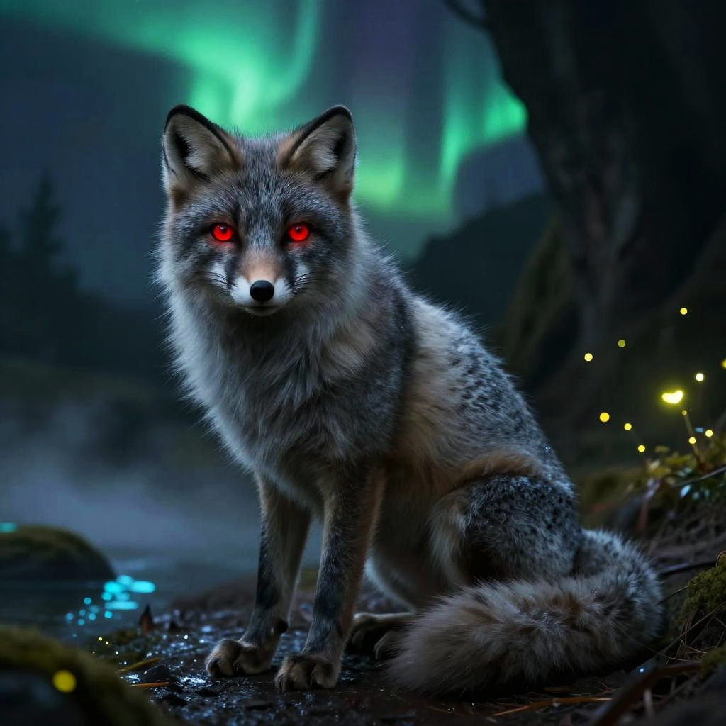 A detailed, full-length portrait of a feral Umbreon with dark grey fluffy fur and glowing red eyes, sitting in a dark cave environment illuminated by ambient fireflies, glowing water, and soft phosphorescent moss. The mystical forest scene features cinematic lighting, a silvery moon, northern aurora, fog, and a reflective stream, creating a moody and atmospheric nighttime setting with realistic proportions and high detail.
