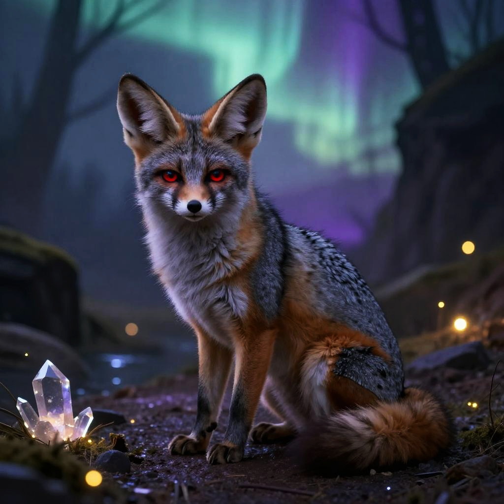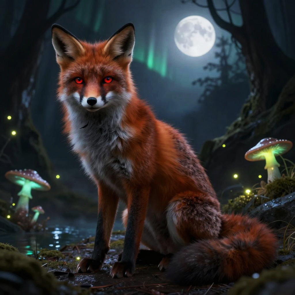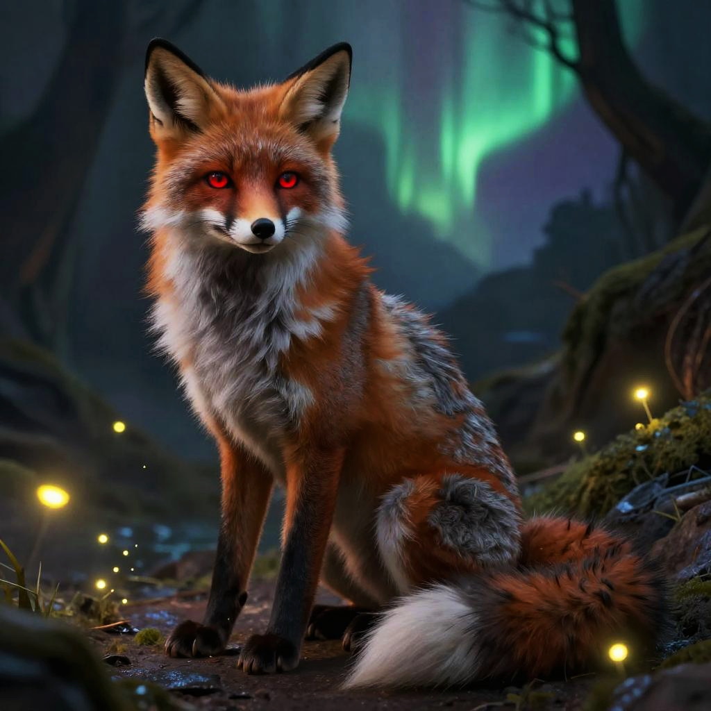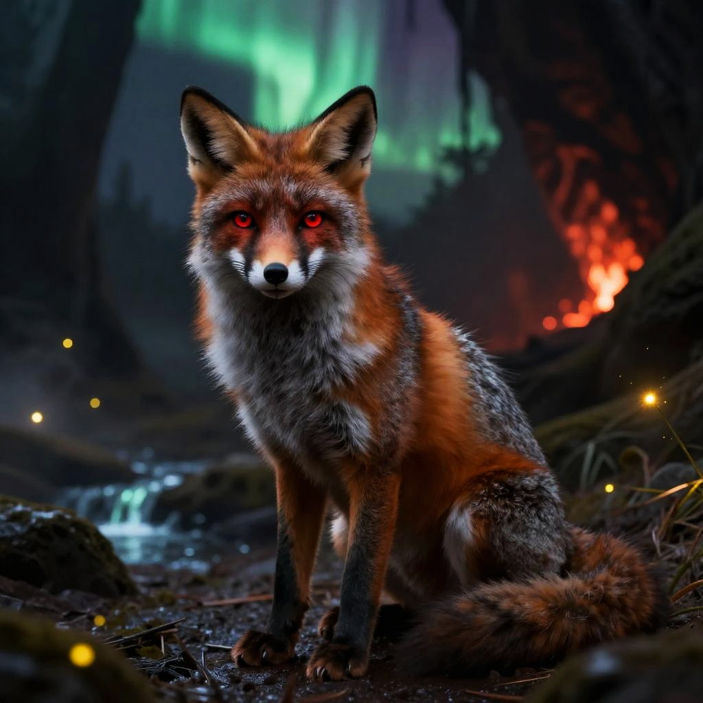 A detailed, full-length portrait of a feral Umbreon with dark grey fluffy fur and glowing red eyes, sitting in a dark cave environment illuminated by ambient fireflies, glowing water, and soft phosphorescent moss. The mystical forest scene features cinematic lighting, a silvery moon, northern aurora, fog, and a reflective stream, creating a moody and atmospheric nighttime setting with realistic proportions and high detail.