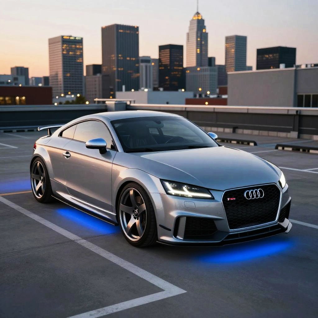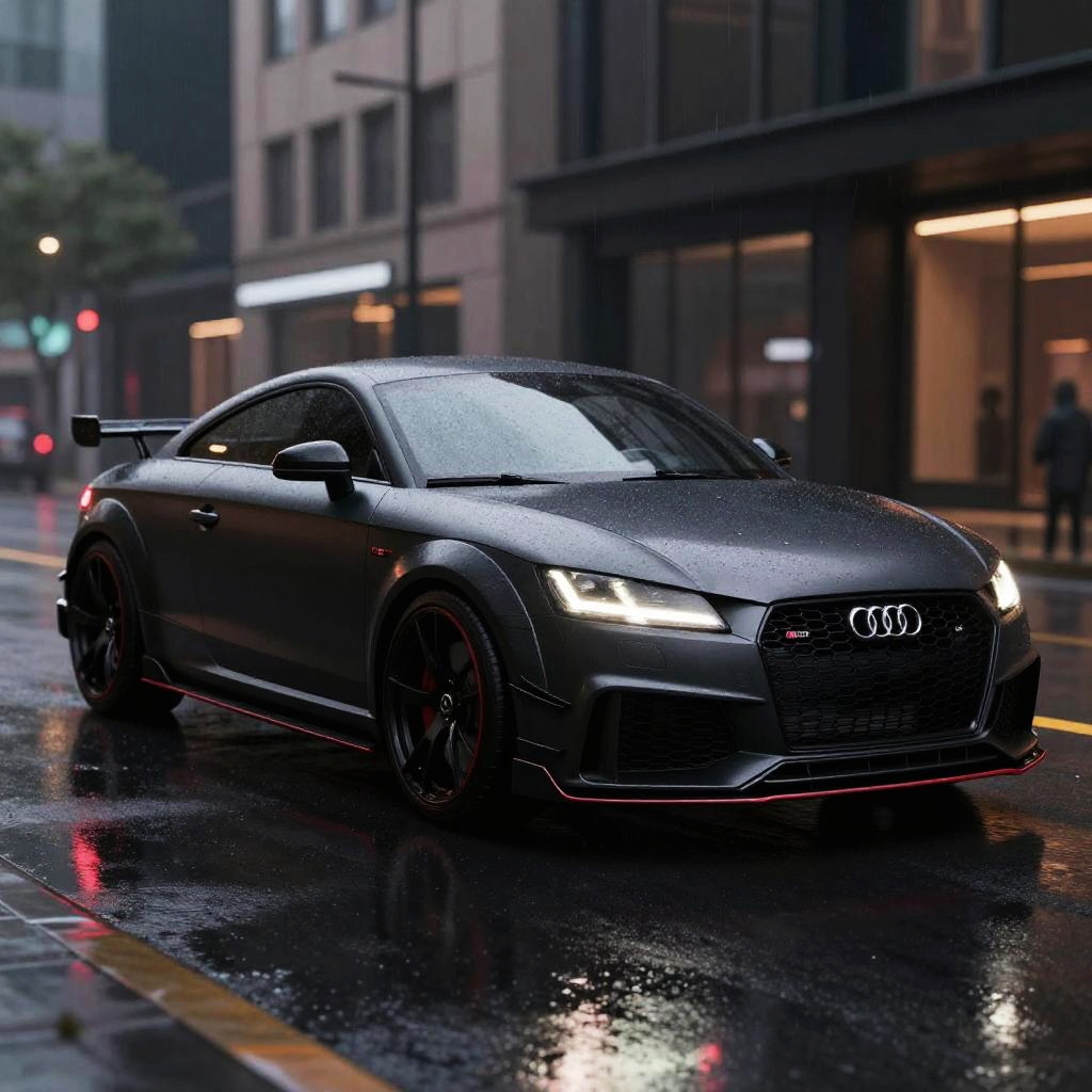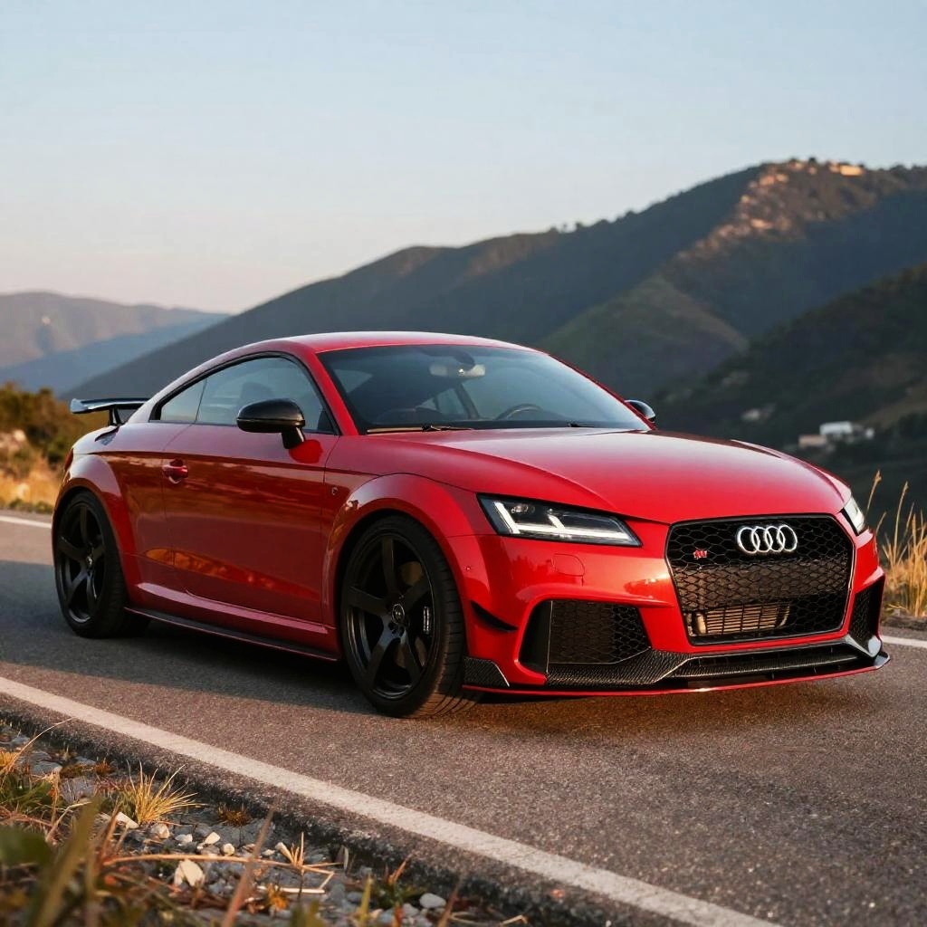 Custom Audi TT RS with vibrant red paint and carbon fiber accents, parked on a mountain road during golden hour, sharp shadows and warm light highlighting curves, hyper-realistic texture details, sporty low stance, high-performance brake calipers visible