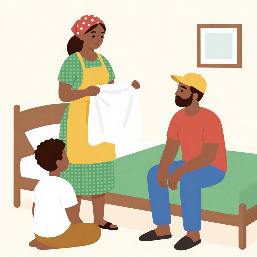 Illustration of three people in a bedroom. A standing woman with dark skin, red polka dot headscarf, green checkered dress, and yellow apron holds a white blanket. A seated man in a red shirt, yellow hat, and blue pants looks at a young boy in a white shirt and brown pants. Bed with green cover in background.