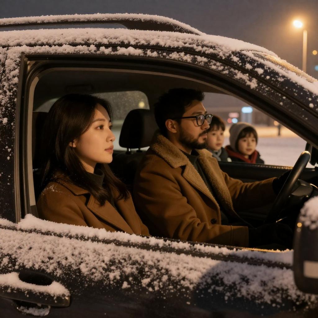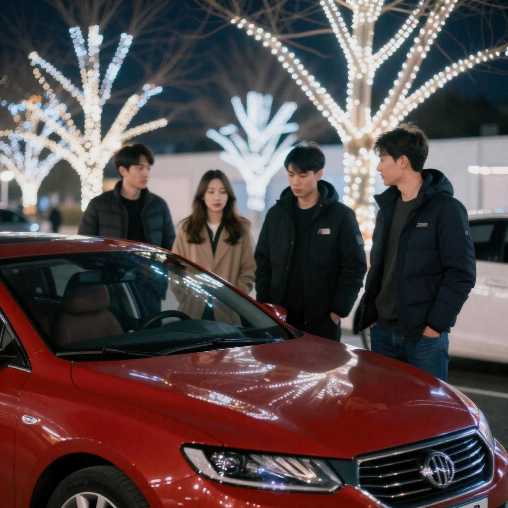 Photograph of a nighttime scene with a bright red car in the foreground. Four people, two men and two women, stand around the car. The background is filled with countless twinkling white lights, creating a festive, illuminated effect. The car's glossy surface reflects the lights, adding a dynamic, glowing ure.