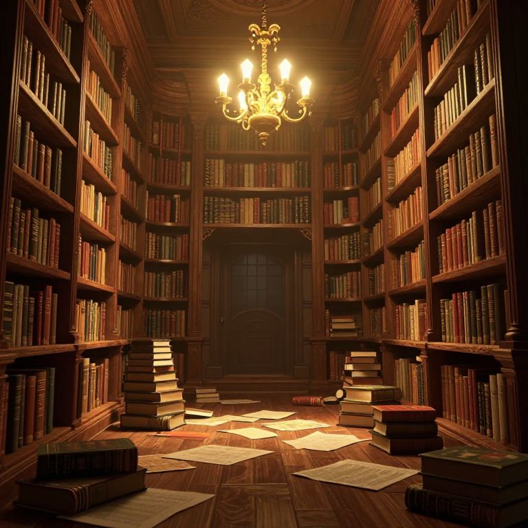 Photograph of a dimly lit, grand library with tall, wooden bookshelves filled with numerous books on both sides. A large, ornate chandelier with glowing bulbs hangs from the ceiling, casting a warm light. The wooden floor is scattered with stacks of books and papers. In the background, a dark wooden door is centered between the bookshelves. The overall atmosphere is rich and scholarly, with a vintage, timeless feel. The lighting creates deep shadows, enhancing the room's depth and the texture of the wood and books.