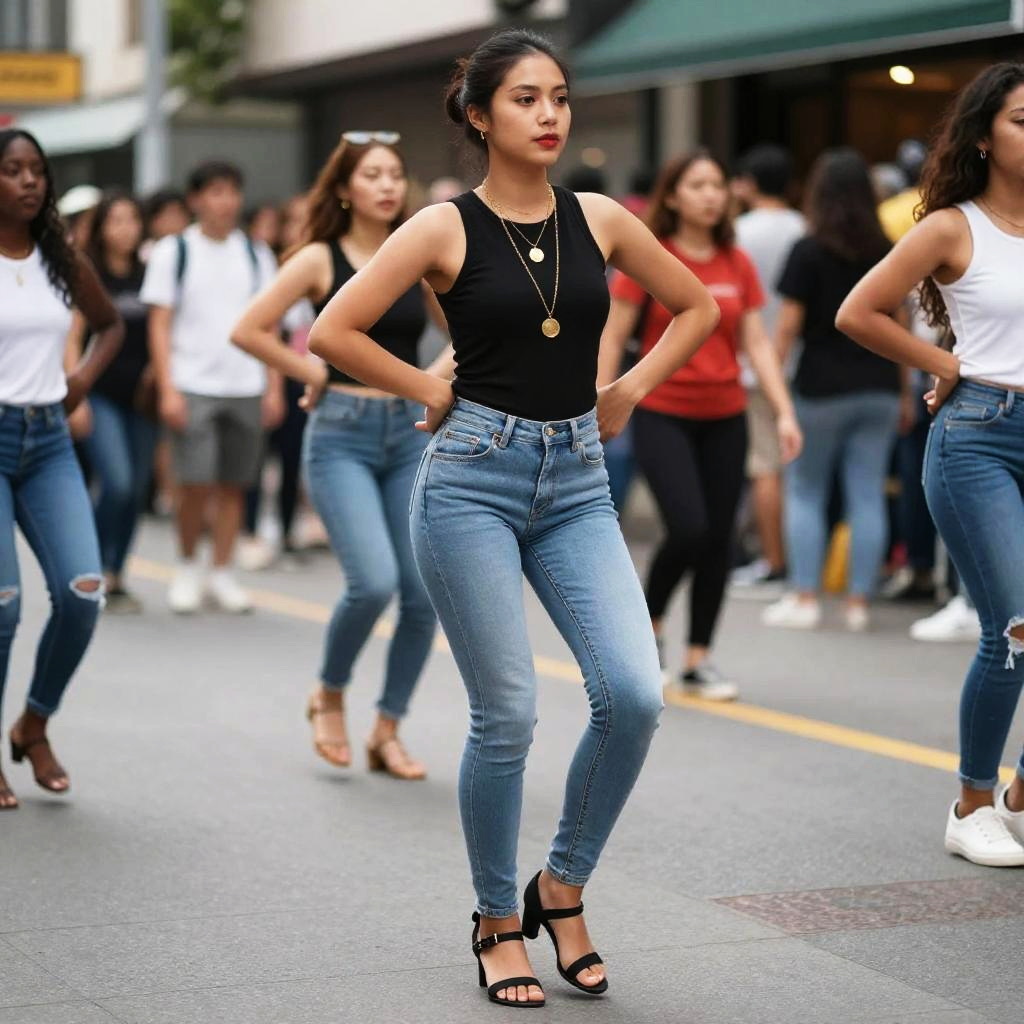 A slim woman in a sleeveless black tank top and light blue skinny jeans, accessorized with layered gold pendant necklaces and black strappy open-toe heels, stands amidst a vibrant city street during a cultural dance, captured in the visual style of JC Staff. Sexy. Pretty face and beutiful eyes