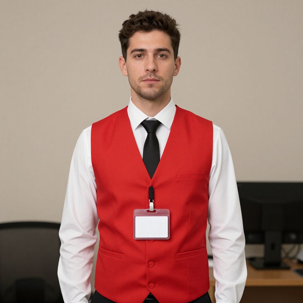 Man in Red Vest Name Tag Costume