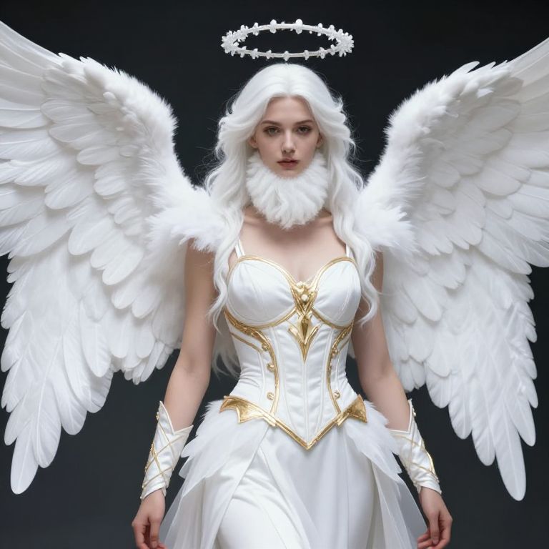 Female angel with white wings and a white beard, wearing a white outfit with gold accents.