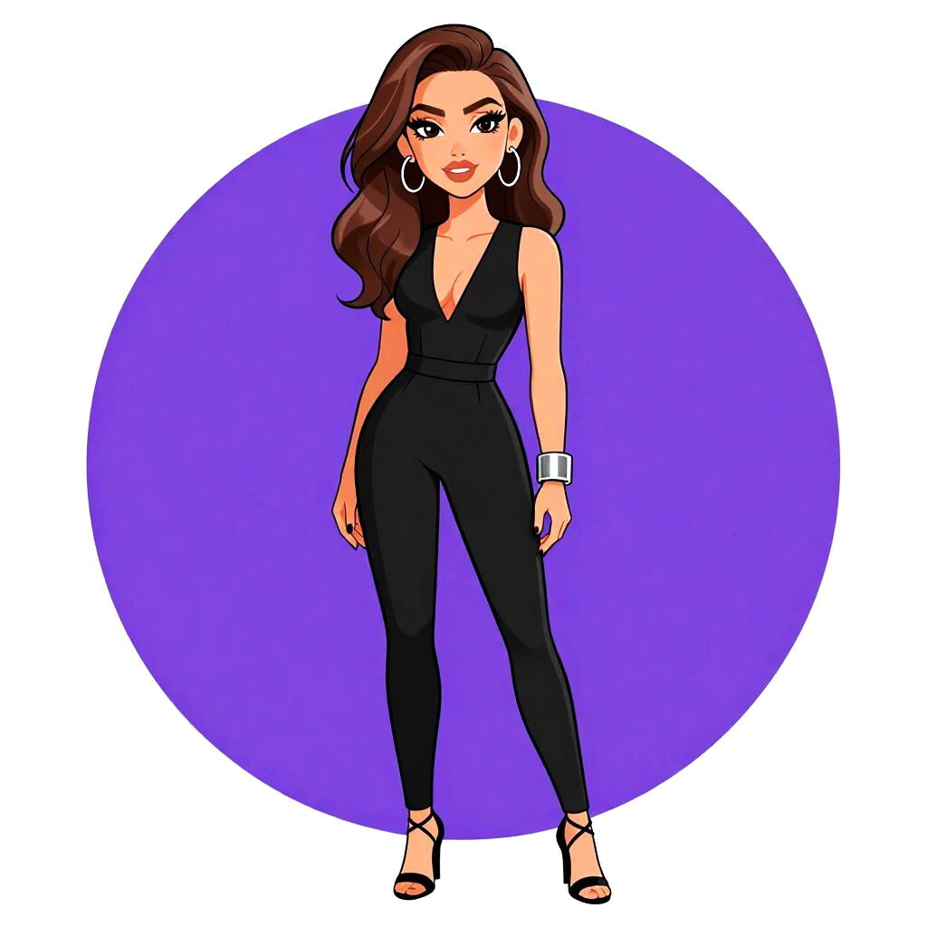 Woman with pretty face and pretty hair. Woman, glam, sequined bodice with geometric patterns in gold and black, plunging neckline, thin straps, flared solid black skirt, short hemline, large metallic cuff bracelet. --sref 1467