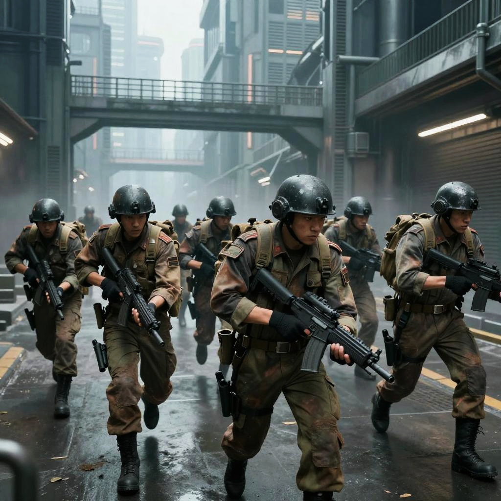 Realistic photo.a squad of renegades, wearing worn-out uniforms, engaged in escaping from a high-tech prison, set in a futuristic metropolis, drawn in the bizarre and dystopian style of Q Hayashida. realistic photo
