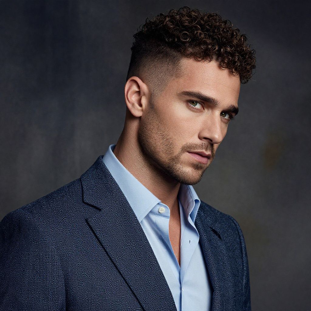 A fit European man with a curly crop hairstyle, captured in a high-fashion editorial style with a focus on detailed grooming, wearing tailored clothing, and set against a moody, artistic background.