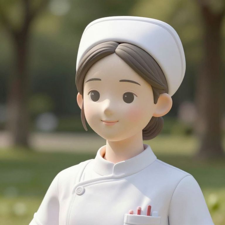 3D rendered image of a young female nurse with smooth skin and brown hair tied back, wearing a traditional white nurse uniform and cap. The nurse is standing outdoors in a park setting under natural sunlight, with a soft and clear background. The image features a detailed and realistic style with a warm and inviting atmosphere.