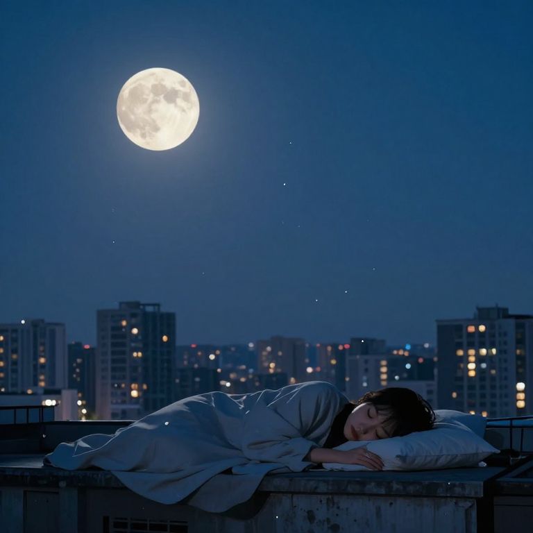 A photograph of a young Asian man with short black hair, lying asleep on a rooftop under a grey blanket. He rests his head on a white pillow, facing right. The background features a dark blue night sky with a large, bright full moon at the top left, surrounded by faint stars. Below the sky, a cityscape of tall buildings with lit windows is visible. The man's relaxed posture and serene expression contrast with the illuminated, bustling cityscape. The image evokes a peaceful, dreamlike atmosphere.