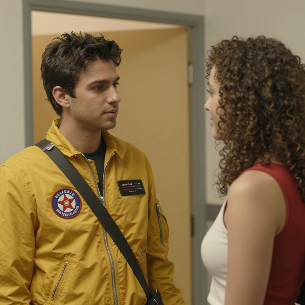 Two men in a dimly lit room. Man with black curly hair, medium skin tone, wearing a red shirt and brown leather jacket, sits with arms crossed, looking slightly to the right. Man with blonde hair, light skin tone, in a green jacket, sits facing him. Dark green ured wall and window with closed blinds in the background. Black table in foreground.