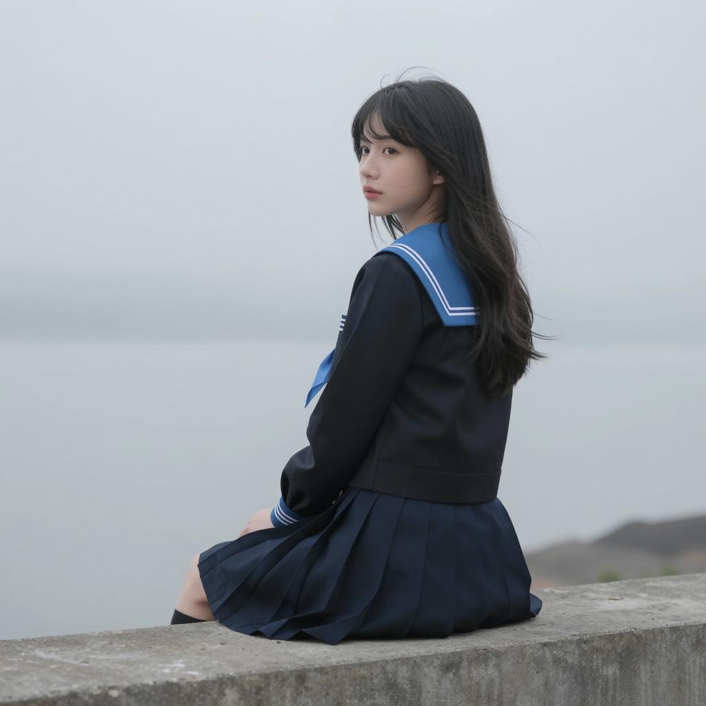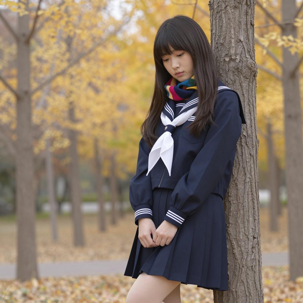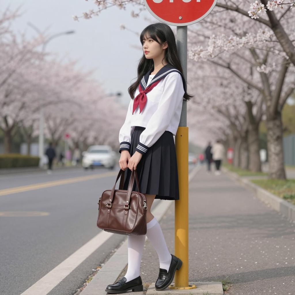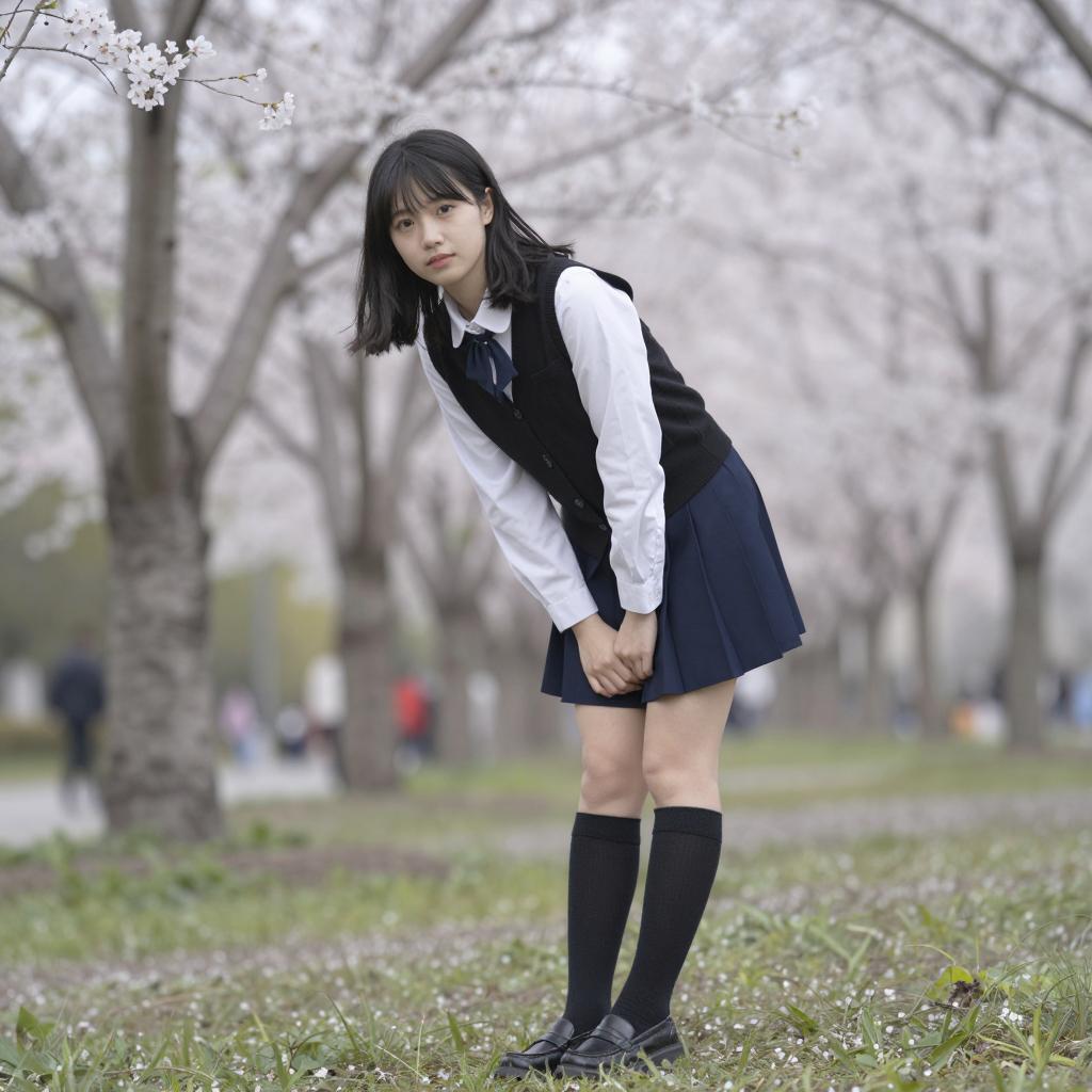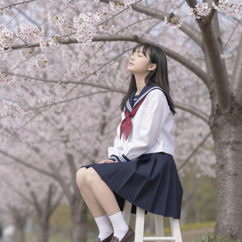 Girl in Navy School Uniform Walking Through Cherry Blossoms