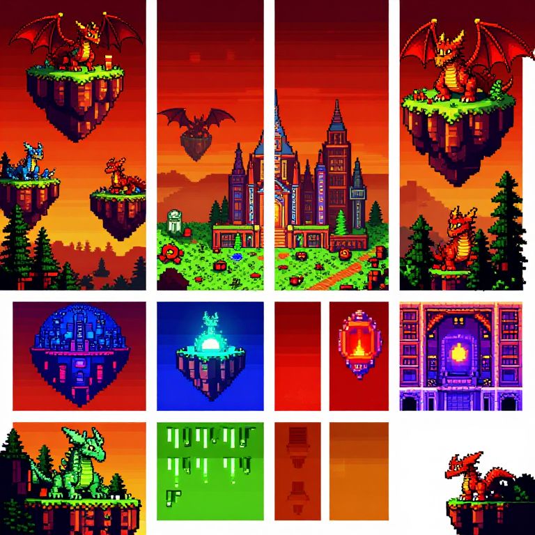 Pixel art collage of vibrant, fantasy-themed scenes: floating islands, castles, dragons, glowing structures, and colorful skies, in bold reds,