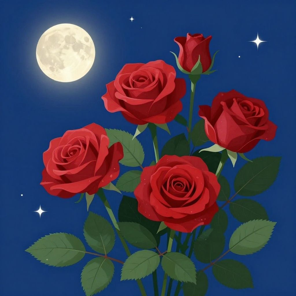 Digital illustration of vibrant red roses with lush green leaves set against a deep blue night sky, featuring a glowing full moon and twinkling stars.