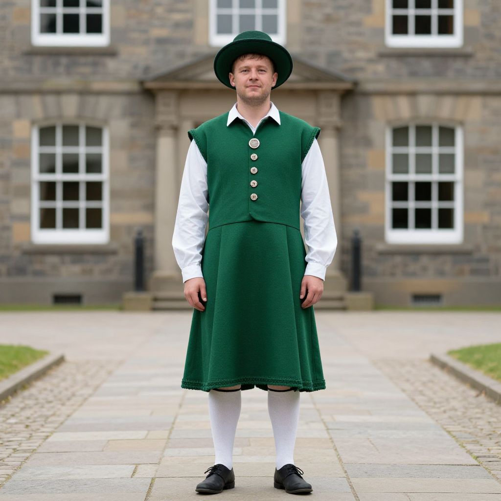 Irish Costume Adult, man in a green dress and hat standing in front of a building