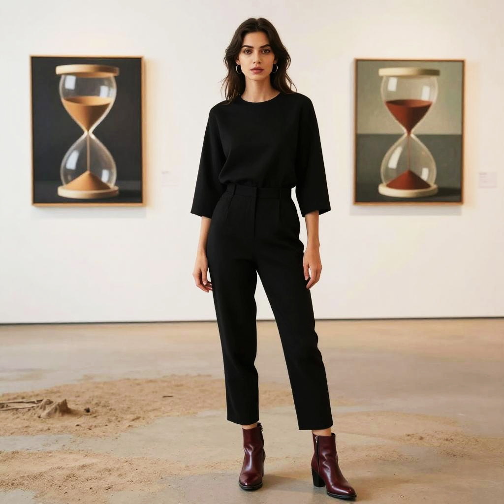 A Hourglass woman in a minimalist black jumpsuit with a relaxed fit and burgundy leather ankle boots stands in an art exhibition in a desert landscape, embodying the visual style of hakusensha. Sexy. Pretty face and beutiful eyes