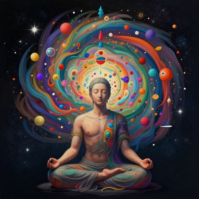 Digital artwork of a meditating, shirtless, Asian man with a colorful, swirling galaxy of planets and energy orbs behind him.