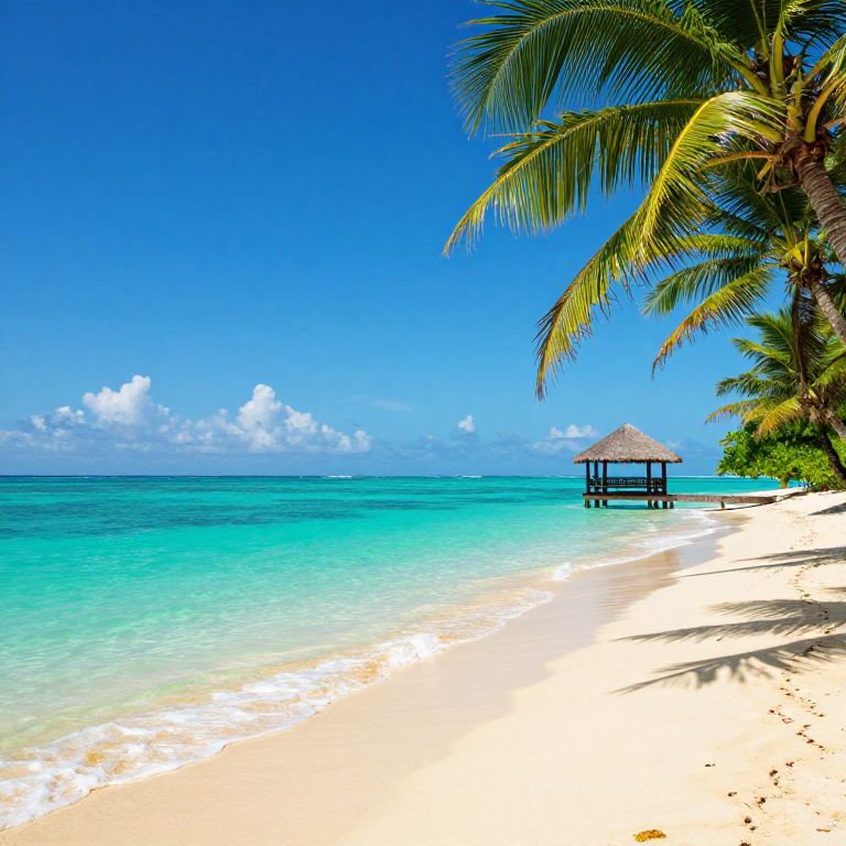 Tropical solitude unfolds as a quaint wooden cottage perches atop a rocky islet, surrounded by vibrant greenery, including a tall palm tree and lush foliage, all reflected in the crystal-clear turquoise waters beneath a serene sky dotted with fluffy white clouds.