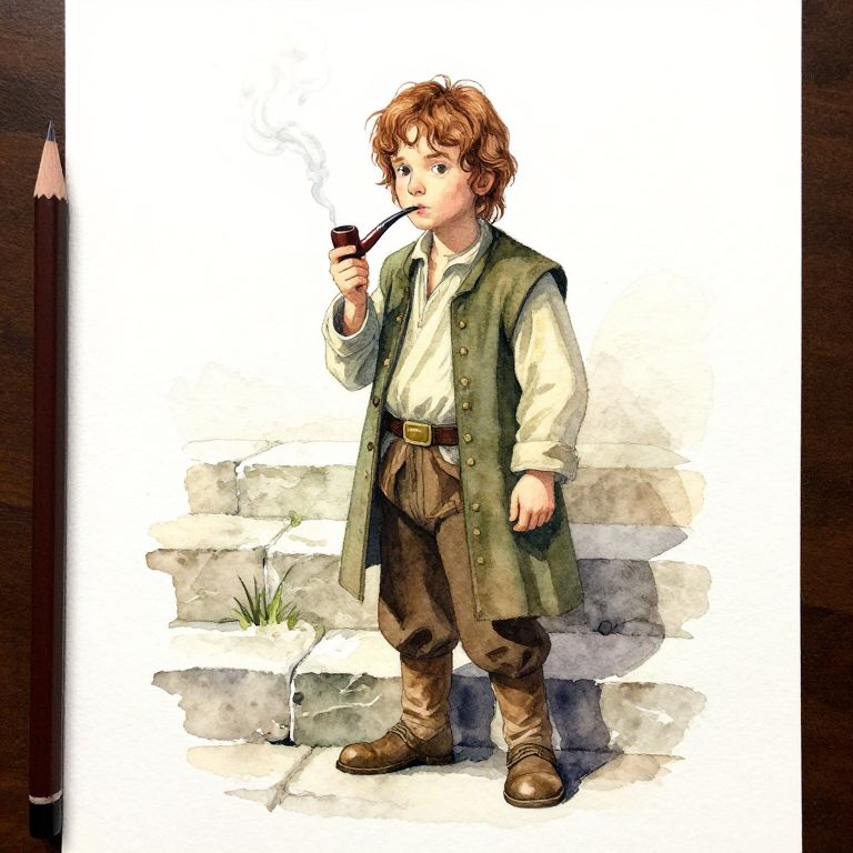 "Pencil And Watercolor Drawing frodo baggins from the 2001 film directed by peter jackson, standing on some stone steps smoking a pipe.,"