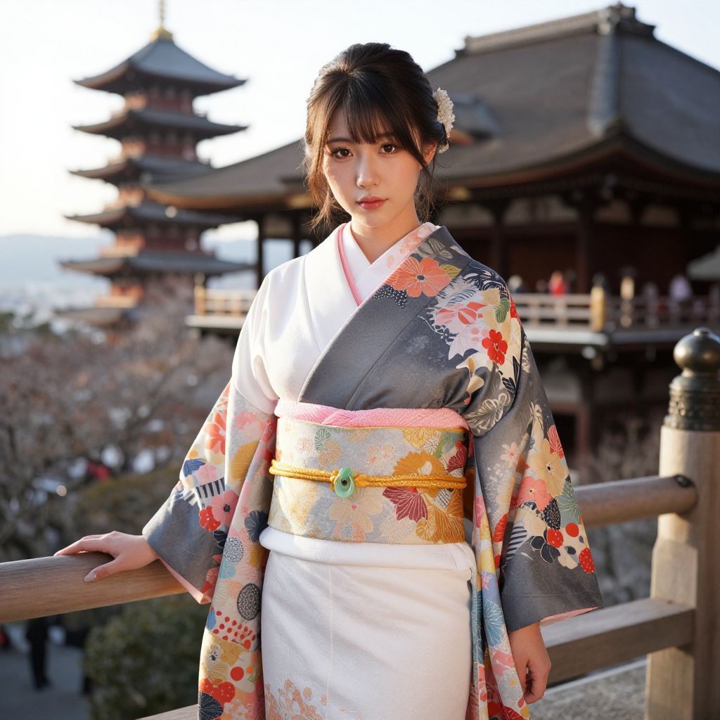 Photograph of an East Asian woman with fair skin and straight black hair adorned with a white hairpin, standing on a wooden balcony. She wears a traditional Japanese kimono featuring a gray background with colorful floral patterns, a white inner layer, and a yellow floral obi belt. The background shows a traditional Japanese temple with multiple-tiered roofs, blurred to focus on the subject. The lighting is natural, highlighting the woman's serene expression and the intricate details of her kimono.