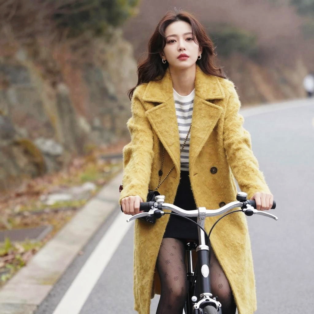 Photograph of a young Asian woman with long, wavy brown hair cycling on a deserted road. She wears a thick, yellow wool coat over a black and white striped shirt, black shorts, and sheer black tights. She holds the black bicycle's handlebars with both hands and has a focused expression. The background features a blurred, tree-lined, rocky hillside and a white road edge. Her makeup is subtle, with red lipstick. The overcast sky and muted colors suggest a cold, autumn day. The image has a sharp focus on the woman, with a shallow depth of field.